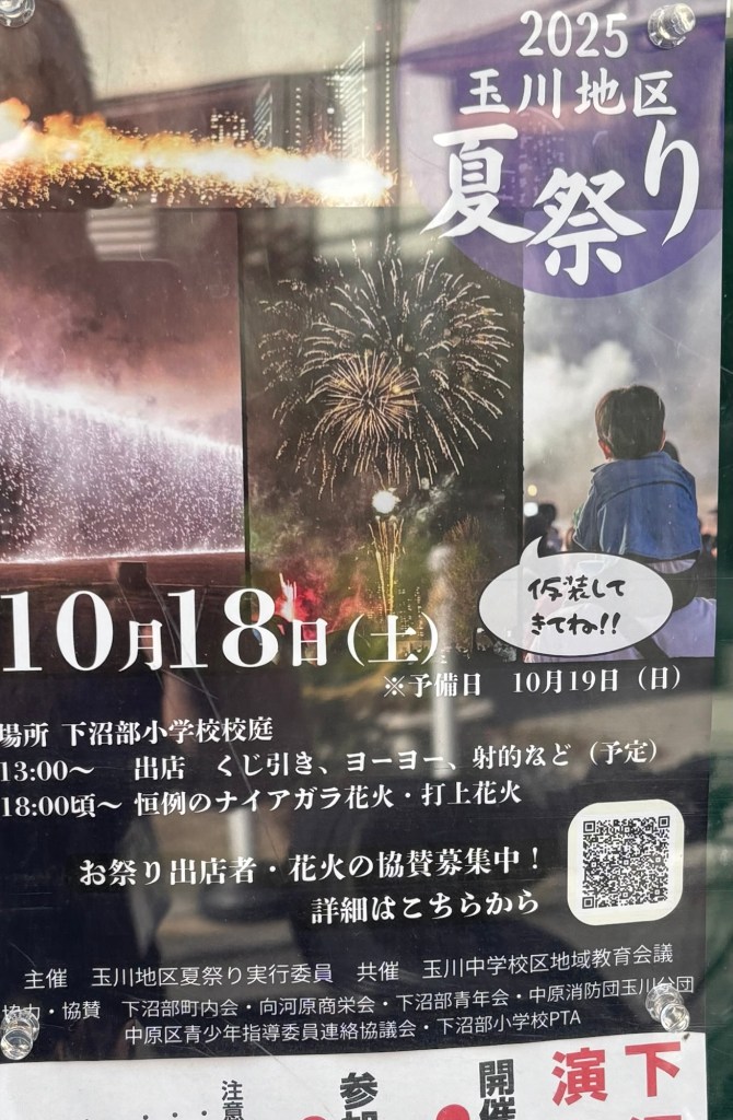 10/18(土) に2025 玉川地区 夏祭りが下沼部小学校で開催されるようです。予備日10/19(日)
